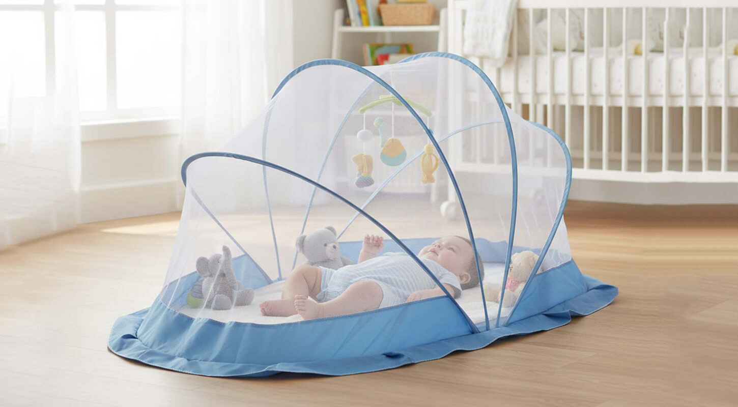 Soft, foldable baby bed with breathable mosquito net ensuring comfort, safety, and peaceful sleep.