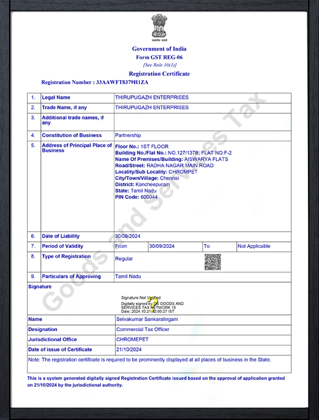 THIRUPUGAZH ENTERPRISES is a dynamic and customer-focused enterprise based in Chennai, Tamil Nadu. Established in 2024, we specialize in delivering high-quality products and services tailored to meet the diverse needs of our clients across various sectors.
